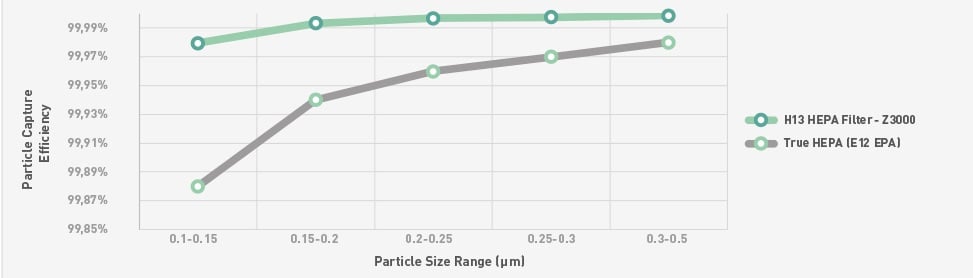 Un tipico filtro "True HEPA" è in grado di catturare il 99,97% delle particelle a 0,3 micron, ma raggiunge un livello di efficienza inferiore al MPPS (0,1-0,2 micron), quindi nel complesso è meno efficiente di un HEPA H13 . Allo stesso modo, un HEPA H13 avrà un'efficienza superiore al 99,97% a 0,3 micron, che è il valore a cui viene testato un filtro "True HEPA".