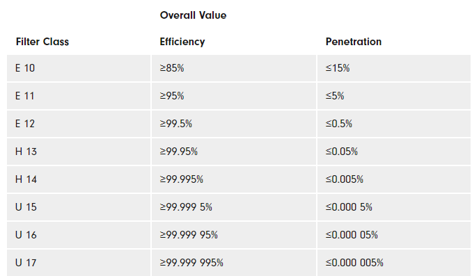 Secondo la norma EN1822, il filtro deve catturare almeno il 99,95% delle particelle (in un singolo passaggio) aventi la dimensione delle particelle più penetranti (MPPS). Questa dimensione delle particelle è tipicamente compresa tra 0,1-0,2 micron. Il risultato dei test di efficienza presso l'MPPS determinerà la classificazione assegnata.